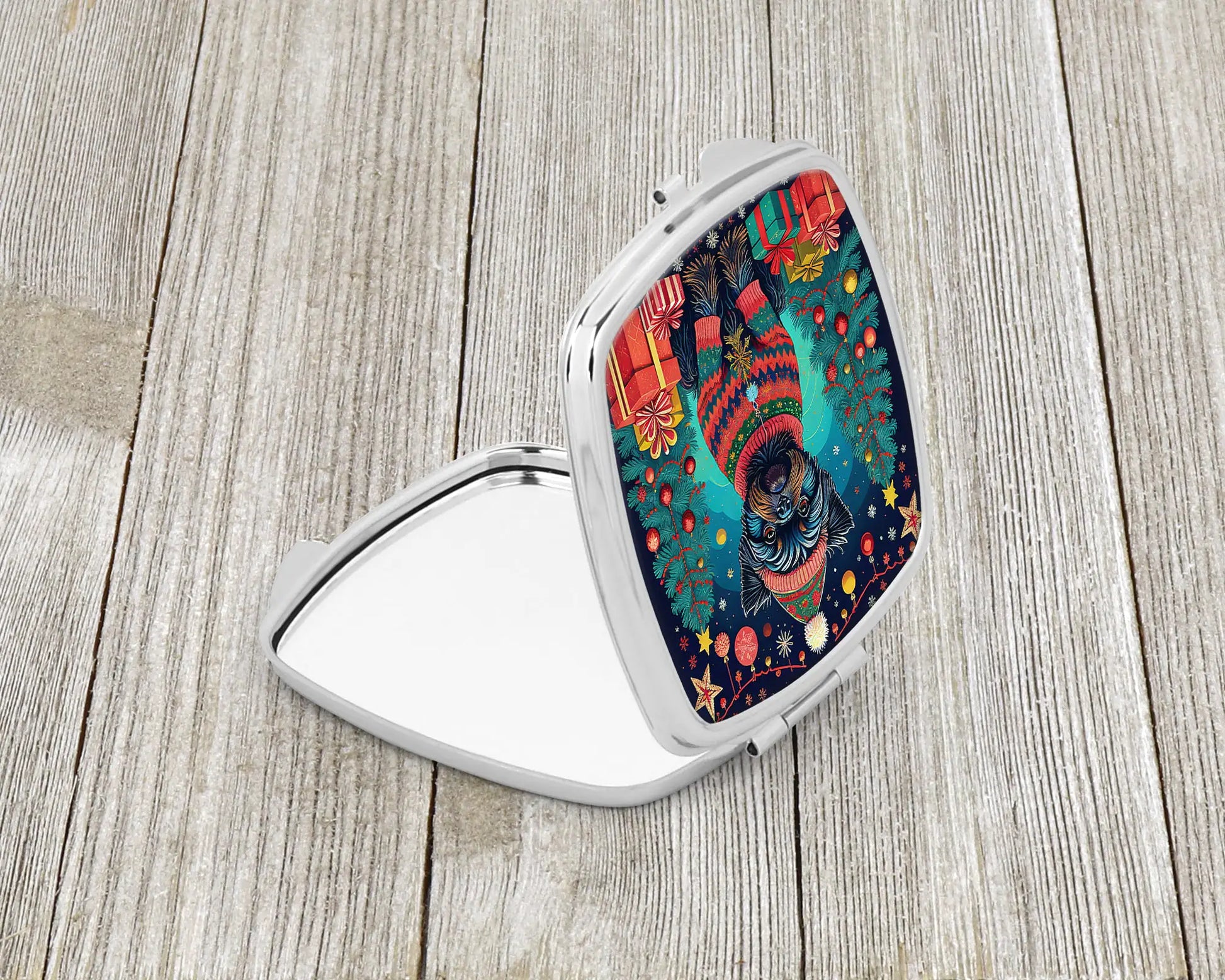 Compact Mirror featuring breed specific Affenpinscher artwork. Celebrate Christmas with this Christmas Compact Mirror. Introducing our Square Compact Mirror, a blend of elegance, functionality, and compactness, perfect for on-the-go touch-ups. This Silvertone metal mirror, with dimensions of 2.75 inches x 3 inches x .3 inches, fits effortlessly into your purse, handbag, or pocket, ensuring that you can check your appearance anytime, anywhere. Our compact mirror stands out with its eye-catching artwork on the front, adding a dash of style to this practical accessory. It is more than just a mirror; it's a statement piece that reflects your personality and aesthetic. When opened, this compact reveals two mirrors inside, doubling your perspective for precise touch-ups. The Silvertone metal construction ensures durability while maintaining a lightweight feel, making it an ideal everyday carry item. Whether you're rushing to a meeting, prepping for a dinner date, or just need a quick check on your look, our Square Compact Mirror is your reliable companion. Experience the perfect blend of style and practicality with this must-have accessory.