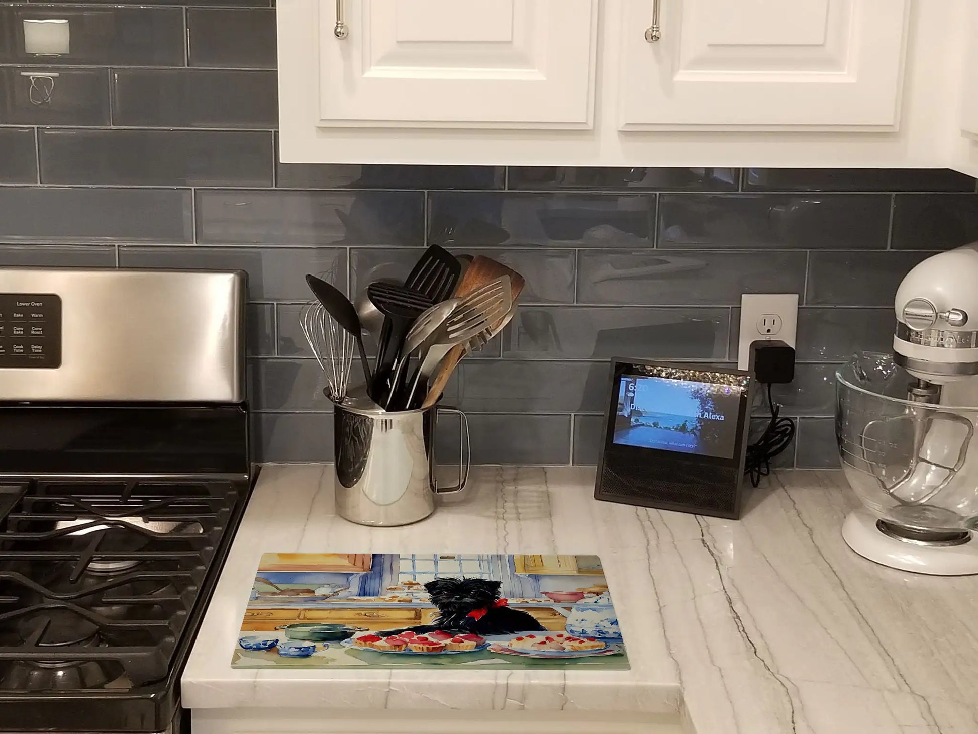 Glass Cutting Board featuring breed specific Affenpinscher artwork. Celebrate Christmas with this Christmas Cutting Board. Introduce your kitchen to the vibrant, large Decorative Glass Cutting Board from Caroline's Treasures. Crafted from resilient tempered glass, this board is not only a utilitarian necessity but also a colorful art piece. With its generous dimensions of 15 inches in height and 12 inches in length, it offers ample space for all your cutting needs. Every piece showcases captivating artwork from distinguished artists, bringing an aesthetic edge to your kitchen. Beyond its attractive design, this cutting board ensures your countertop stays pristine and unscathed, owing to its heat-resistant properties. Engineered with user convenience in mind, it features non-skid feet for stability, and rounded corners for additional safety. Its robust construction renders it virtually unbreakable, guaranteeing longevity. The board comes with protective feet bumpers, maintaining its position during use. This product is recommended to be hand washed only. Proudly printed and assembled in the United States, this cutting board exemplifies superior craftsmanship. With Caroline's Treasures' Decorative Glass Cutting Board, you're investing in a blend of functionality and artistic flair.